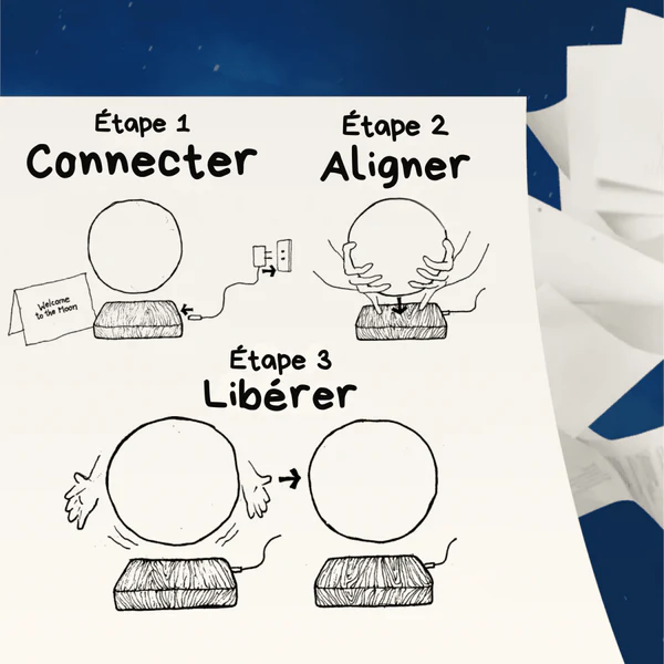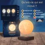 La lune flotte réellement dans l’air grâce à une base magnétique et tourne doucement sur elle-même pour un effet visuel impressionnant.