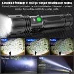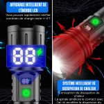 Équipée d’une LED améliorée, cette torche projette la lumière jusqu’à 1000 mètres, ce qui la rend idéale pour les activités en plein air. L’écran LCD affiche en temps réel le pourcentage de batterie, permettant un suivi facile du niveau de charge.